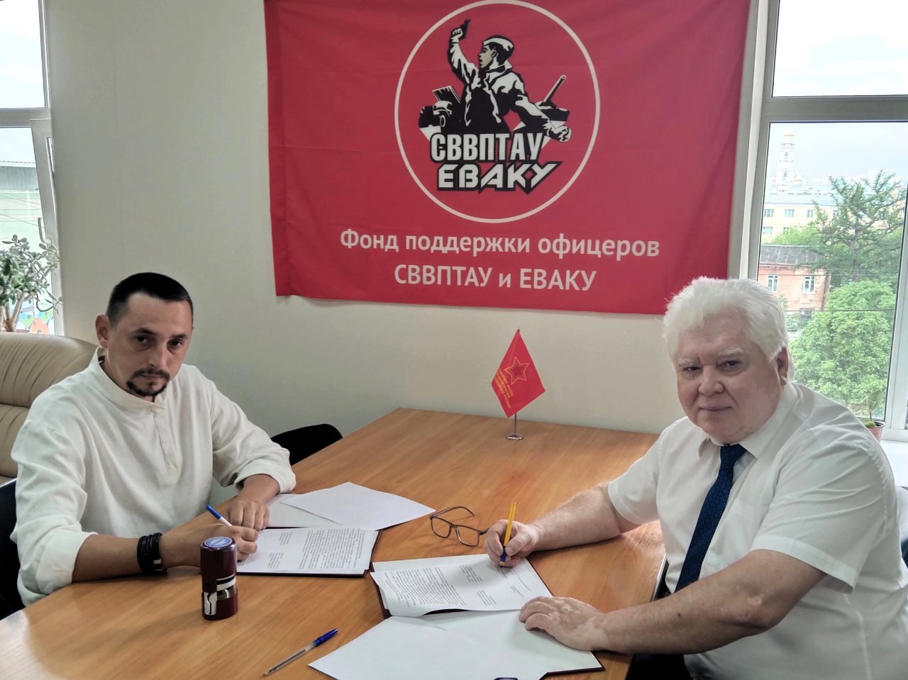 Заключили соглашение о совместной работе в помощи фронту и патриотическому воспитанию молодежи с АНО СДЦ «Здоровая Нация». Документ подписали руководители общественных организаций: выпускник СВВПТАУ 1984 года Рафаэль Шихов и выпускник ЕВАКУ 2008 года Максим Буслаев. Плечо к плечу будем работать во благо нашей страны.